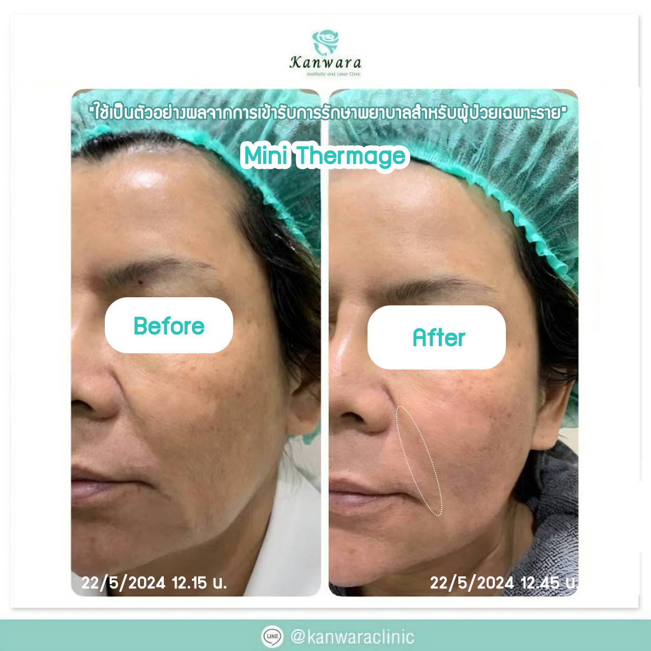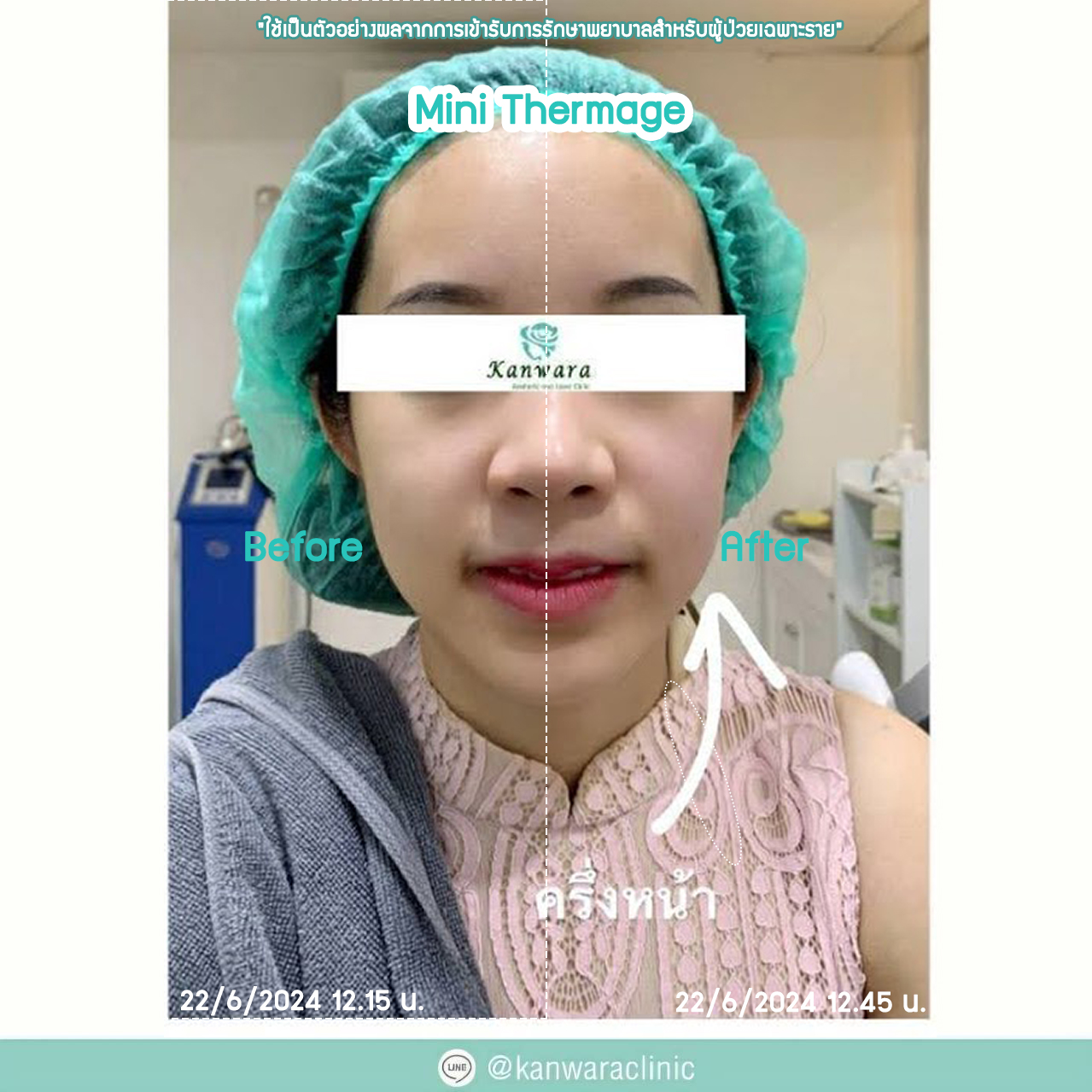 Mini Thermage คือ เทคโนโลยีที่ส่งคลื่นความถี่วิทยุไปที่ชั้นผิวหนังแท้โดยเฉพาะค่ะ ไม่ทำลายเซลล์ไขมันใต้ผิวหนัง โดยเข้าไปทำให้เกิดอุณหภูมิที่สูงขึ้นอย่างเหมาะสมแล้วกระตุ้นให้ร่างกายเรามีการสร้างคอลลาเจนในชั้นผิวหนังขึ้นมา แล้วทำให้ใบหน้ายกกระชับขึ้น ผิวตึงขึ้น รูขุมขนน้อยลง ริ้วรอยน้อยลงค่ะ